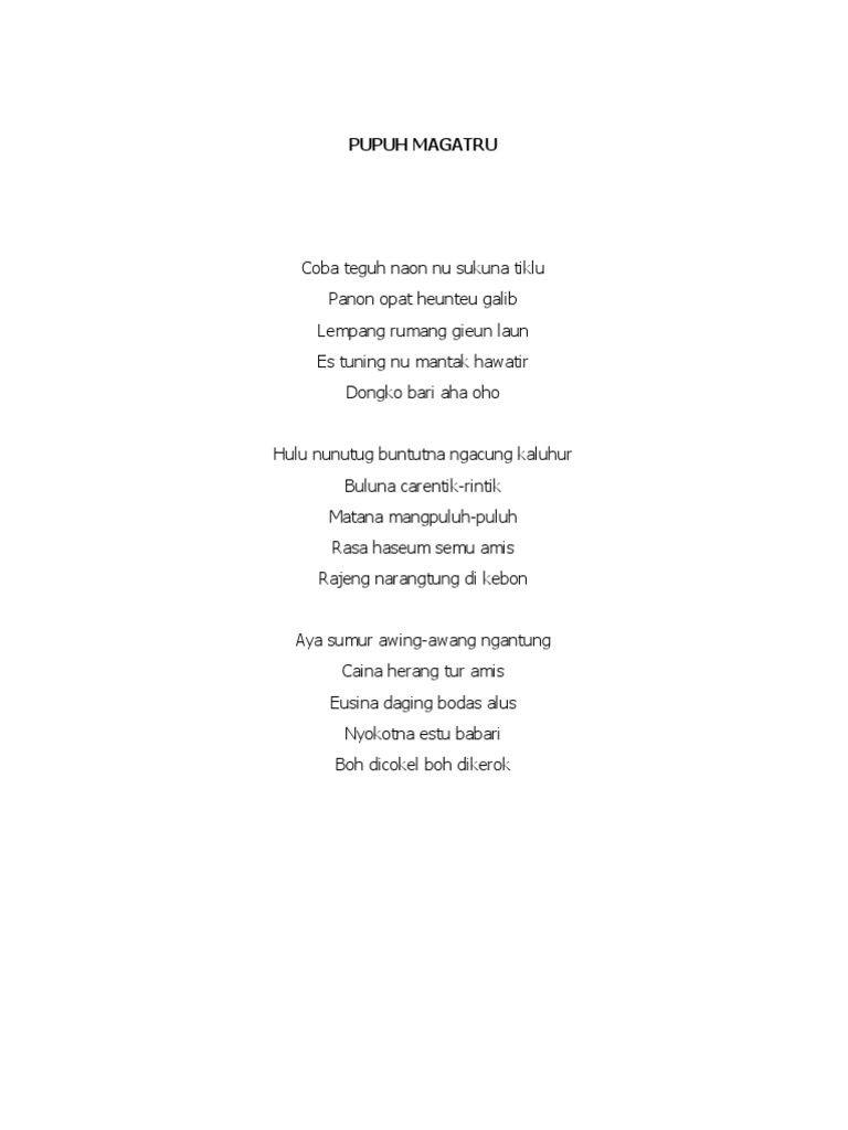 10 Pupuh Magatru Pdf Google Drive from lh4.googleusercontent.com Aug 16, 2016 · setiap bait (pada) dari pupuh asmarandan ini terdiri dari 7 baris (padalisan). Smk darma bakti 8:51:00 am komentar related posts. Jan 24, 2013 · contoh pupuh asmarandana. Apakah pupuh berasal dari bahasa sunda? More images for pupuh asmarandana contoh » Contoh pupuh asmarandana eling eling mangka eling rumingkang di bumi alam darma wawayangan bae raga taya. Apr 11, 2021 · 4.2 pupuh sinom tatar sunda. Apa yang ada dalam pupuh sunda?